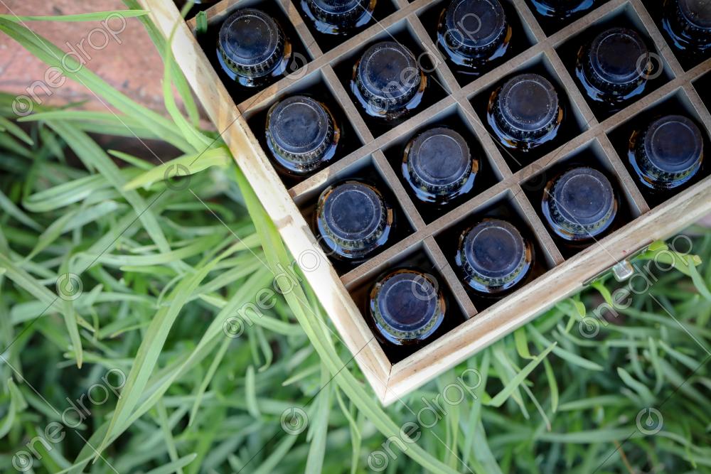 Artistic background image of full wooden storage box from top view surrounded by long grass