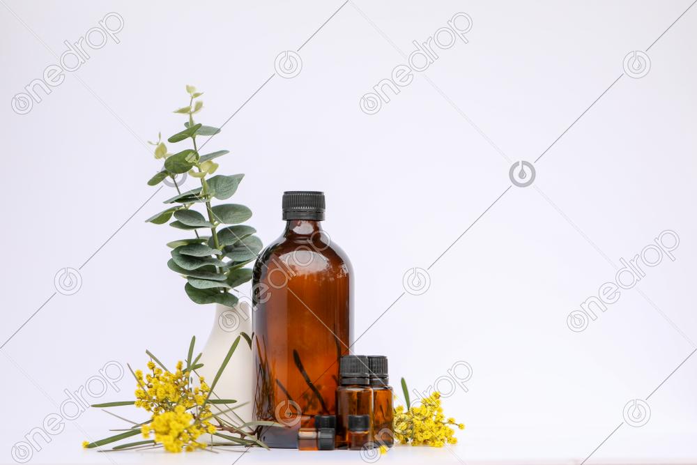 Background image featuring collection of amber bottles on display with fresh yellow wattle flowers with copy space