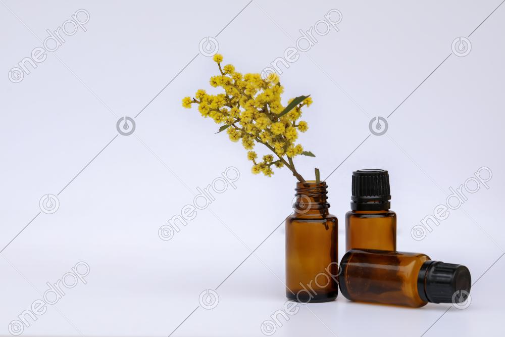 Background image featuring collection of empty bottles with fresh yellow wattle with copy space