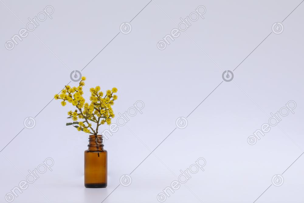 Simple background image featuring empty doTERRA bottle with sprig of yellow wattle on white background with copy space