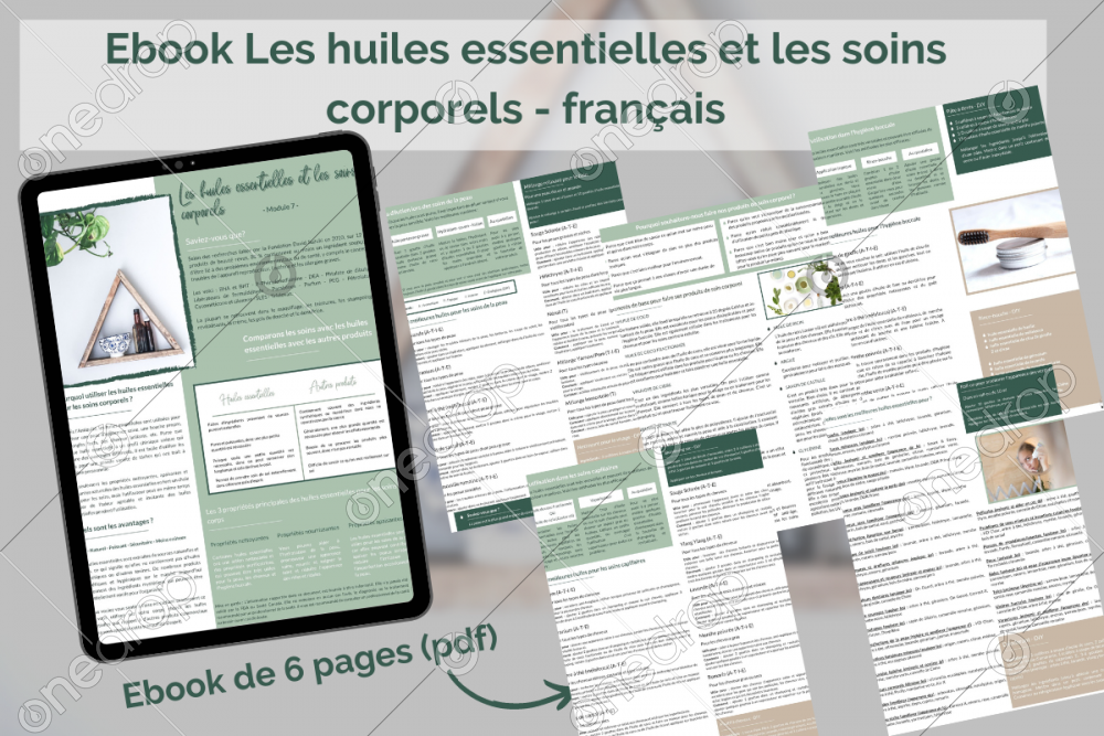 Pour obtenir le e-book complet (145 pages divisé en 18 modules et contient des notions théoriques sur les divers sujets du quotidien, des notions pratiques, des trucs, astuces et recettes pour tous les sujets couverts, ainsi que des notions précises sur les huiles et les besoins courants), cliquez ici.