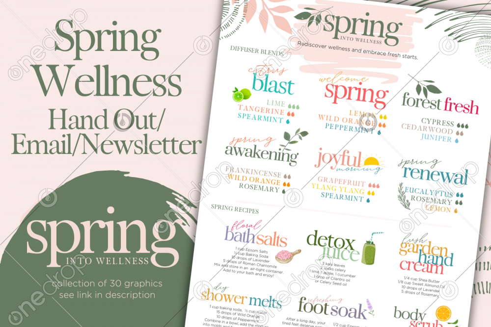 Hand Out or email for the Spring Wellness Collection. Print and mail or handout at your next class. Email to your customers as part of your monthly newsletter or use at the end of a class to inspire some new ways to use oils. Includes recipes for spring and diffuser blends.