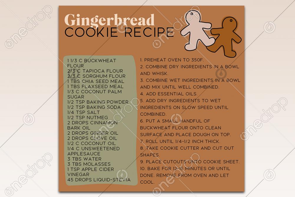 Ingredients + Instructions for Gingerbread Cookies featuring cinnamon bark , ginger, and clove oils.