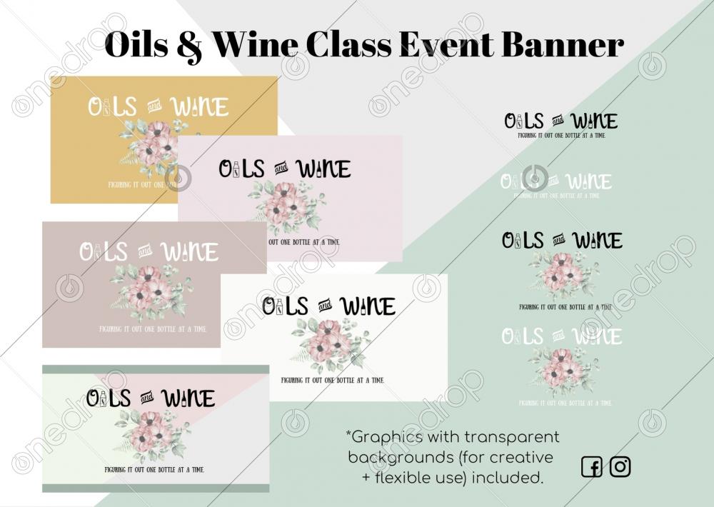 Oils & Wine Class Facebook Event Cover. This download file includes five pre and ready made Facebook event covers in various colors (soft pink, off white, mustard yellow, taupe, and one mixed color design) AND 2 alternate transparent graphics in a black and white set each.
