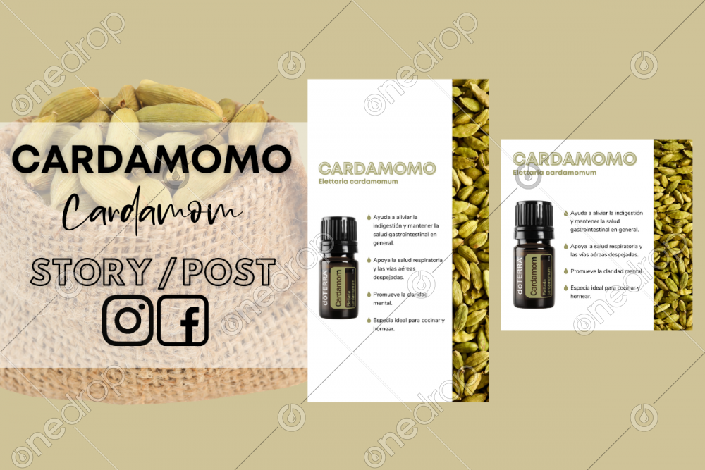 Paquete de 2 imágenes con los beneficios del Aceite Esencial de Cardamomo (Cardamom).