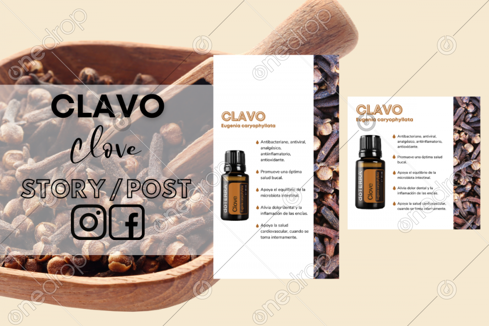 Paquete de 2 imágenes con los beneficios del Aceite Esencial de Clavo (Clove).