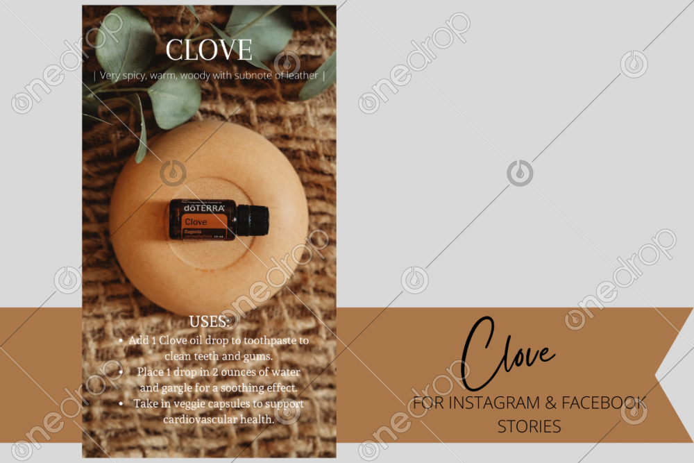 Vertical Image of Clove with uses and aromatic description sized for Instagram and Facebook Stories.