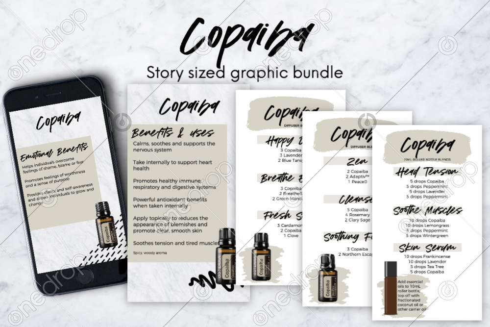 Story sized graphics for Copaiba, perfect for Instagram and Facebook stories and Pinterest pins or stories: Benefits & uses Emotional benefits Diffuser blends Roller bottle blends 5 story sized graphics **please watermark images to protect your investment If you have a request or comment, please use “provide feedback” to email me. If you want me to address you specifically, please include your contact info for a reply.