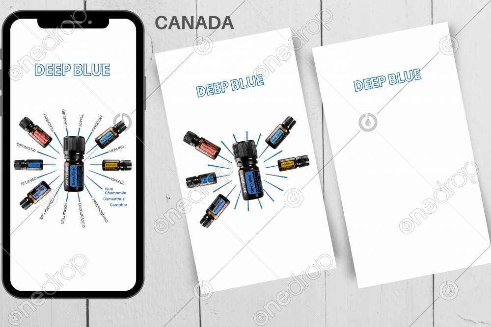 - Includes images of the following oils that are in Deep Blue® Essential Oil Blend; Wintergreen, Peppermint, Ylang Ylang, Helichrysum, and Blue Tansy (mentions Camphor, Blue Chamomile and Osmanthus as ingredients)