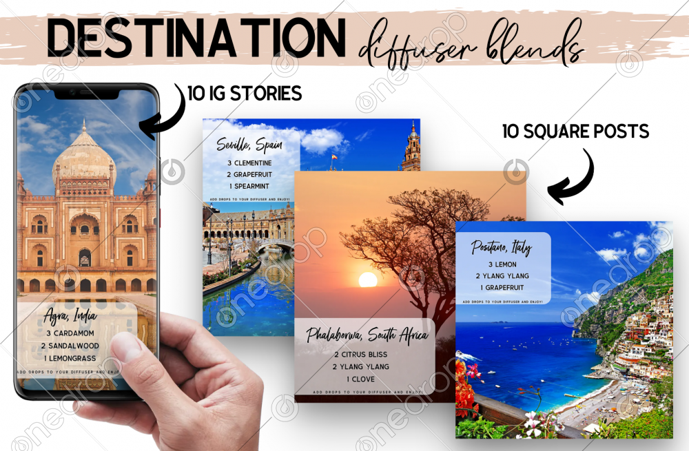 Destination Diffuser Blends. 10 IG Stories and 10 Square Posts. Travel the world without leaving your living room with these diffuser blends.