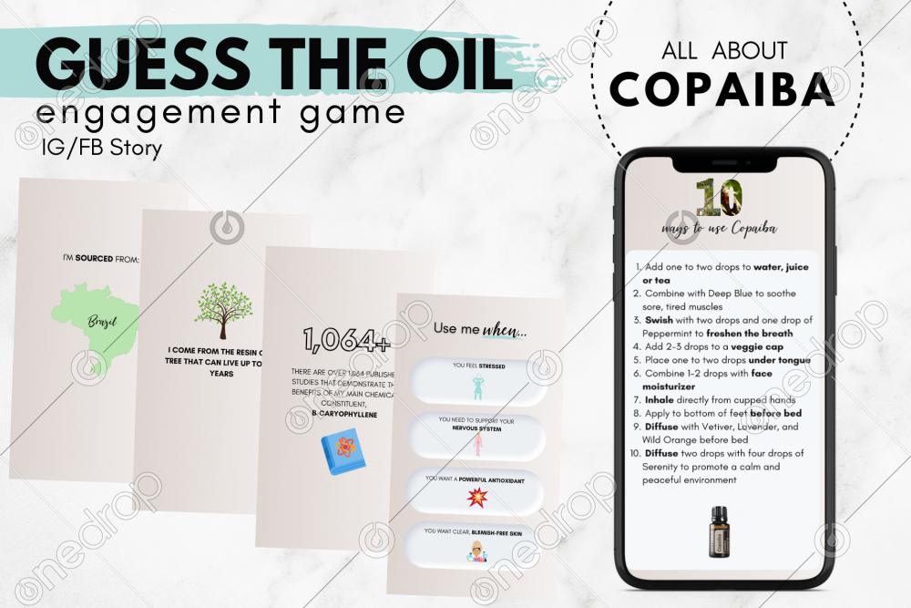 Increase engagement, have some fun, and share stories that create curiosity!! You have SO MANY options for how to use this bundle. Check out more Engagement Games HERE Fun Ideas: Use it to spotlight the oil (on more than 1 slide). Multiple benefits, uses and a Top 10 Slide with MORE uses! Create a game where you never actually share the mystery oil. People have to DM you to learn more! Share the Top 10 slide via DM with anyone that guesses correctly Do a giveaway for everyone that guesses correctly Send a sample to anyone (not enrolled) that makes a guess Features: Minimalist style (add your own GIFS and wording to fit your brand and voice) White also included so you can add your own colors if you wish What's included: Guess the oil cover Sourcing information Smell Number of studies published Chemical constituent Fun Facts Oil Spotlight cover Any guesses slide (add a comment box here) Top 10 Uses of the oil 4 Benefits 4 Ways to use Please be sure to watermark before sharing & follow my contributor page for more! Thank you so much! If you have feedback about this graphic, or any requests to modify it feel free to click on the flag above. If you would like a direct response, please include your name and email. Otherwise, your feedback is anonymous and I'm unable to reply directly to you. Thanks for your support and the opportunity to help you grow your business!!