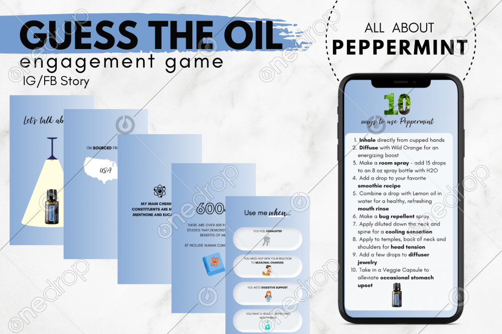 Increase engagement, have some fun, and share stories that create curiosity!! You have SO MANY options for how to use this bundle. Fun Ideas: Use it to spotlight the oil (on more than 1 slide). Multiple benefits, uses and a Top 10 Slide with MORE uses! Create a game where you never actually share the mystery oil. People have to DM you to learn more! Share the Top 10 slide via DM with anyone that guesses correctly Do a giveaway for everyone that guesses correctly Send a sample to anyone (not enrolled) that makes a guess Features: Minimalist style (add your own GIFS and wording to fit your brand and voice) Simple background so you can adjust the size easily across platforms What's included: Guess the oil cover Sourcing information Smell Number of studies published Chemical constituent Fun Facts Oil Spotlight cover Any guesses slide (add a comment box here) Top 10 Uses of the oil 4 Benefits 4 Ways to use Number of Slides Included: 12 Please be sure to watermark before sharing & follow my contributor page for more! Thank you so much! If you have feedback about this graphic, or any requests to modify it feel free to click on the flag above. If you would like a direct response, please include your name and email. Otherwise, your feedback is anonymous and I'm unable to reply directly to you. Thanks for your support and the opportunity to help you grow your business!! Check out more Engagement Games HERE