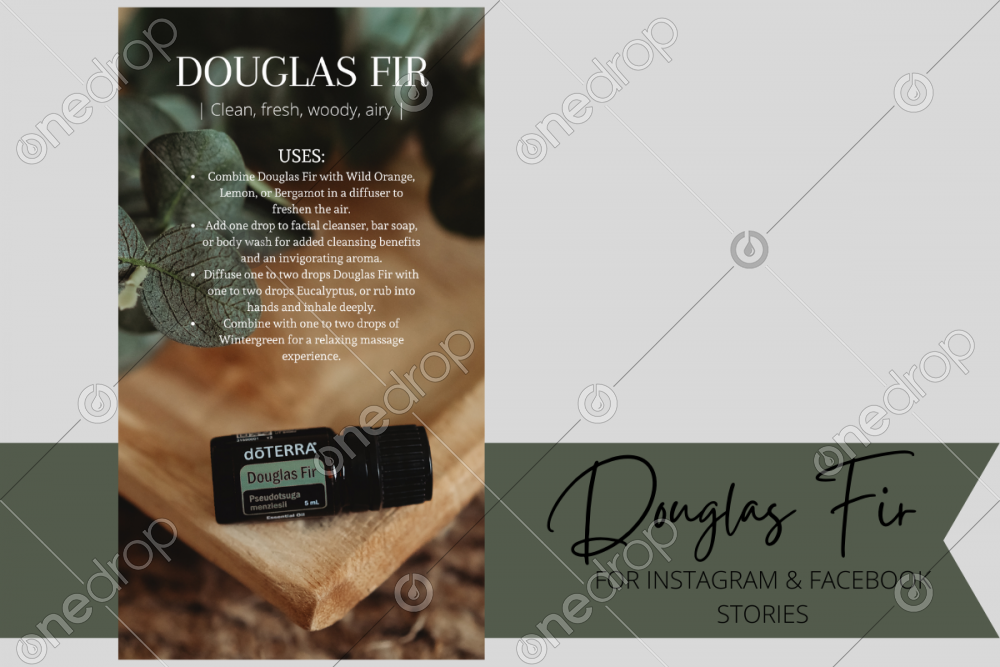 Vertical Image of Douglas Fir with uses and aromatic description sized for Instagram and Facebook Stories.