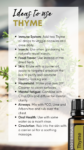 Thought to impart courage to its bearer, Thyme was given to knights and warriors before they went into battle by ladies of the Middle Ages. During this same period, Thyme was often placed beneath pillows to help promote a peaceful sleep and to ward off nightmares. The ancient Greeks used Thyme in their baths and burned it as an incense in their temples while the Egyptians used it in their traditional ceremonies. Today, Thyme is commonly used as a seasoning, but it also produces a potent essential oil that has cleansing and purifying effects for the skin; however, due to its high thymol content, Thyme should be diluted with a carrier oil before application. Experimental research suggests that internal use of Thyme essential oil may benefit the immune system, due at least in part to the thymol and carvacrol content.