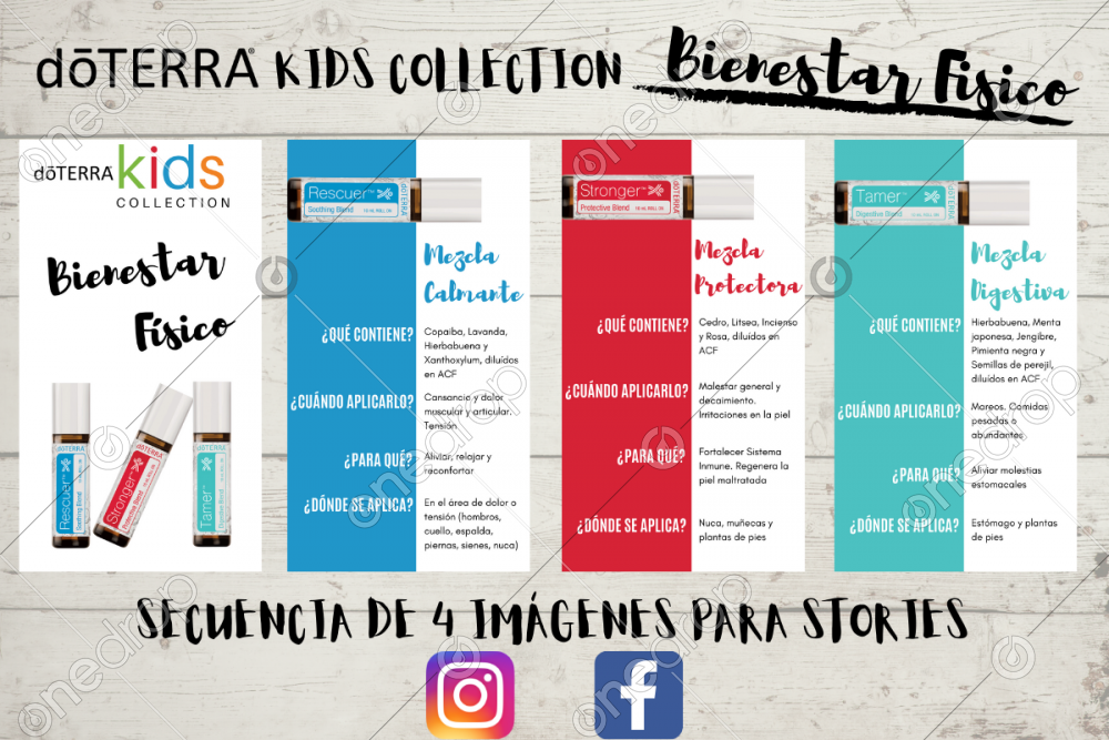 En esta secuencia de 4 imágenes en formato rectangular para Stories de Instagram y Facebook, se muestran las 3 Mezclas de Aceites Esenciales para el Bienestar Físico (Rescuer, Stronger y Tamer) que hacen parte del Kit doTERRA Kids Collection, de una forma sencilla, práctica y colorida.