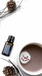 - flat lay, white background featuring 15mL bottle of Peppermint essential oil, holiday mug of hot cocoa, pinecones and branches