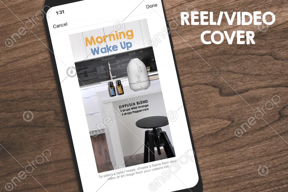 Create a simple reel of you filling your diffuser with this blend of oils. Then, make sure you upload this cover before sharing. If putting on your feed too, remember to move the cropped image up.