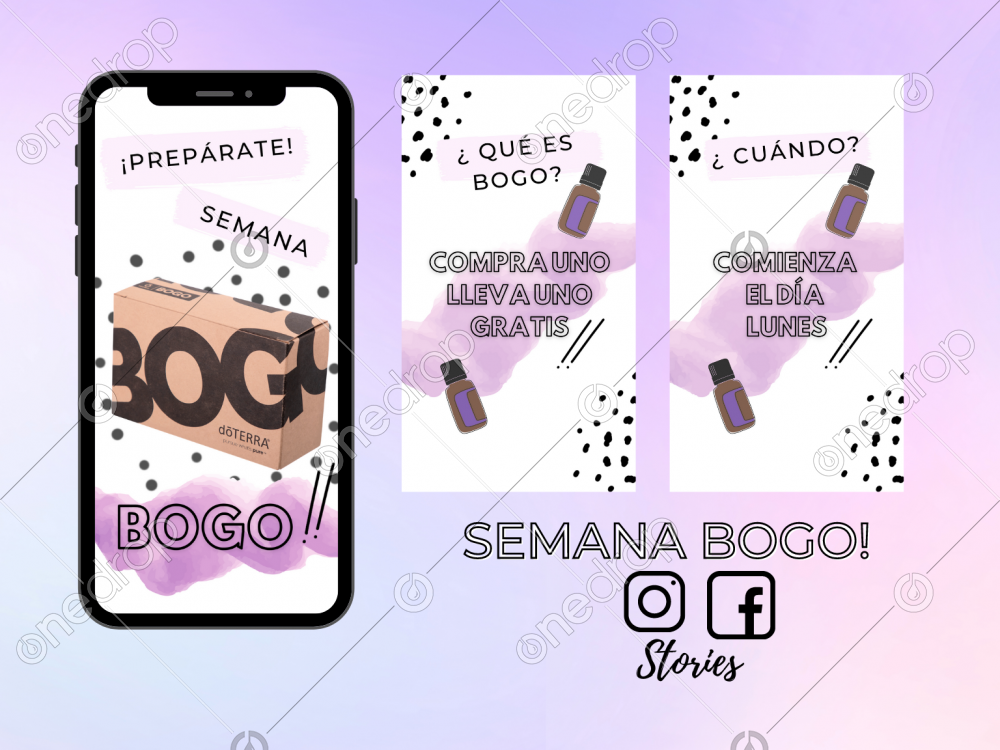 Prepárate para la semana BOGO con estas imagenes con texto en español. Publica en tus historias de Instagram y Facebook.