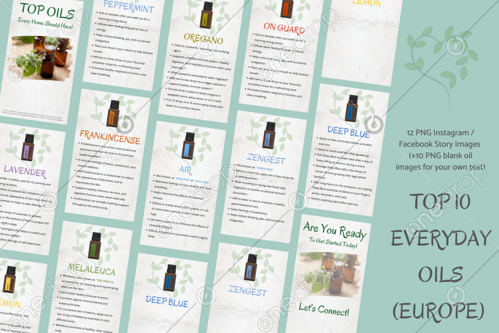 Top 10 Everyday Essential Oils (Europe) - Instagram/Facebook Stories 22 PNG Instagram / Facebook Story Images (1080 x 1920) Cover Images Top 10 Oils with main benefits - Lavender, Lemon, Peppermint, Frankincense, Melaleuca, Oregano, Air, Deep Blue, On Guard, ZenGest (with referral to other names if applicable). Top 10 Oils Image only for your own text Call To Action *Space for logo on cover and call to actions post, along with space for copyright info at the bottom of each image.