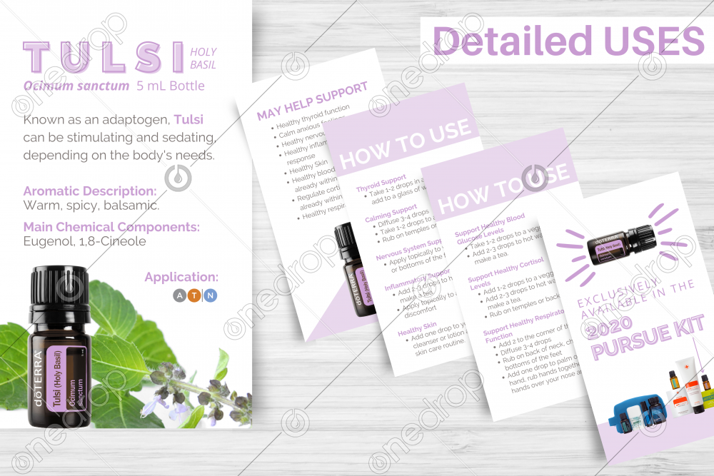 5 Piece Story Pack Tulsi (Holy Basil) (Exclusively Available in the Pursue 2020 Convention Kit) Tulsi essential oil aroma resembles a cross between traditional Basil oil, Anise Oil, and Clove oil. Tulsi is a natural adaptogen and promotes increased energy levels. In ayurvedic medicine, Tulsi has been used to promote normal blood sugar levels.