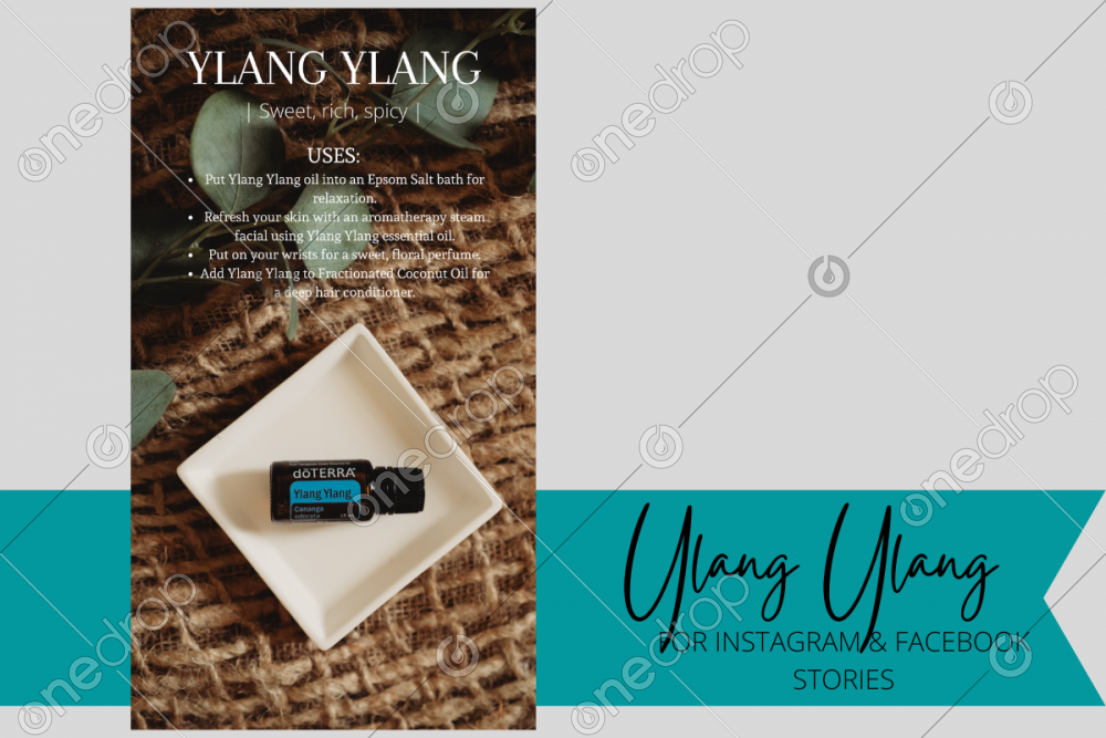 Vertical Image of Ylang Ylang with uses and aromatic description sized for Instagram and Facebook Stories.