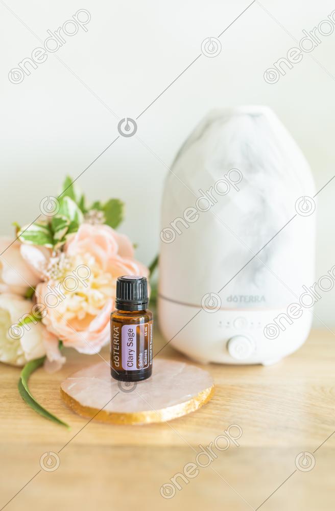15 ml Essential Oil Bottle of Clary Sage with Marble Diffuser and Pink Flowers
