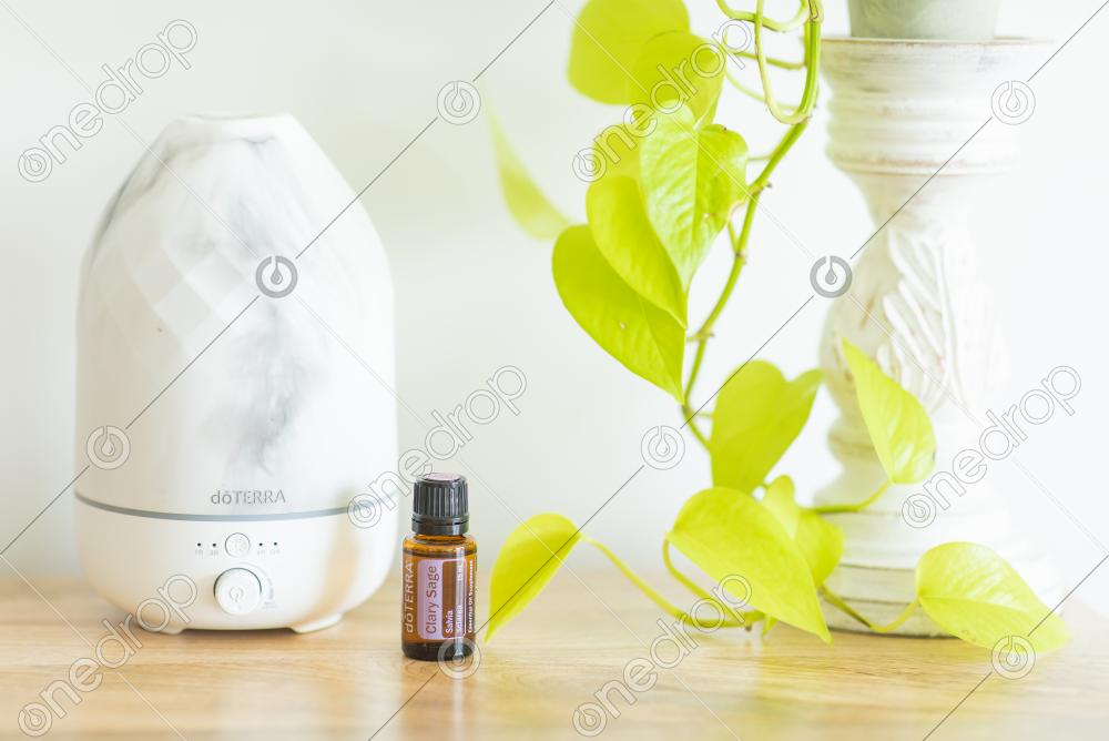A high resolution image of 15 mL Bottle of Clary Sage sitting next to a marble diffuser and plant.