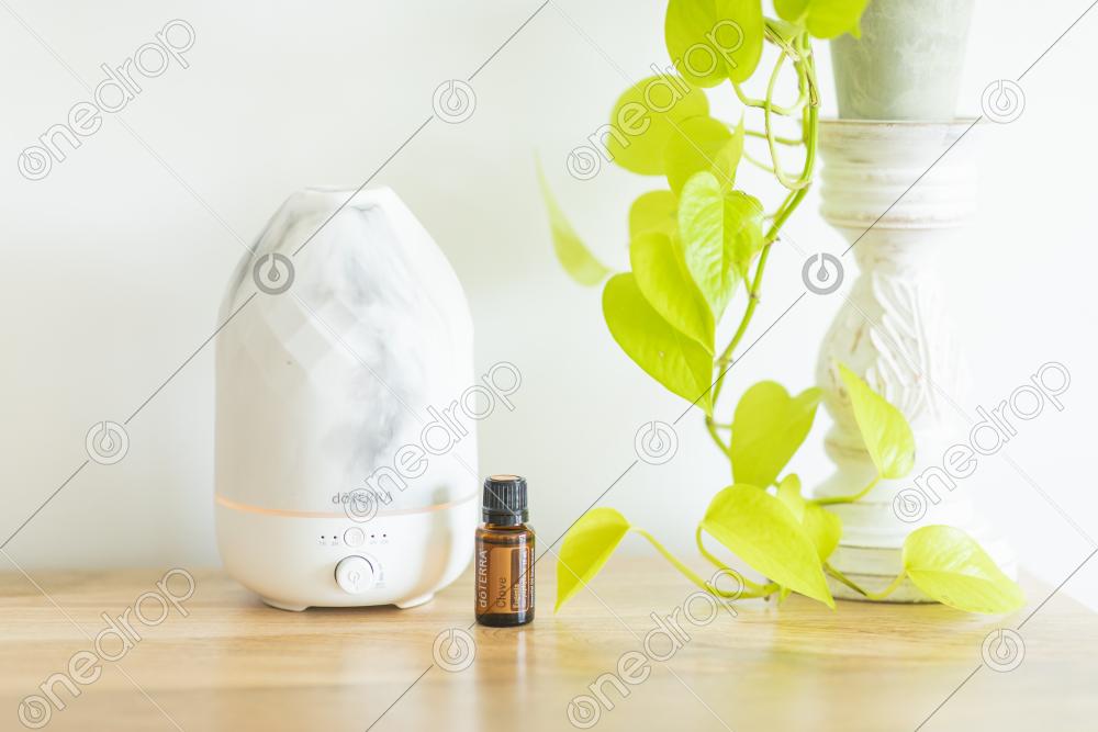 A high resolution image of 15 mL Bottle of Clove sitting next to a marble diffuser and plant.