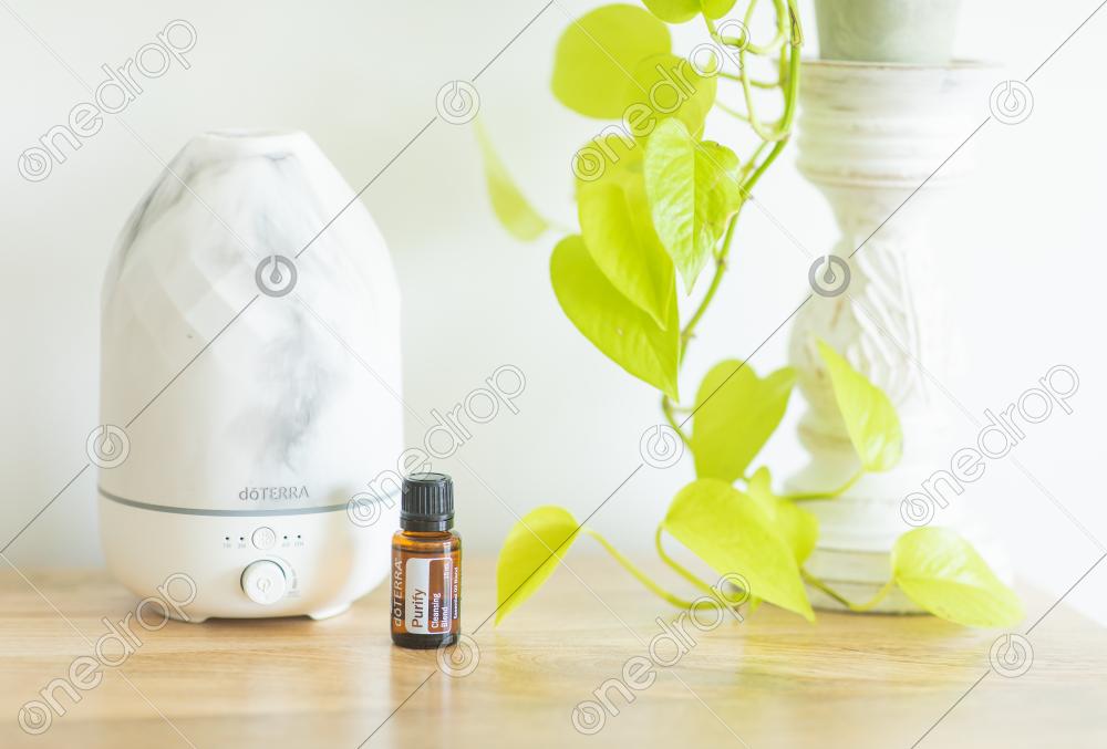 A high resolution image of 15 mL Bottle of Purify sitting next to a marble diffuser and plant.