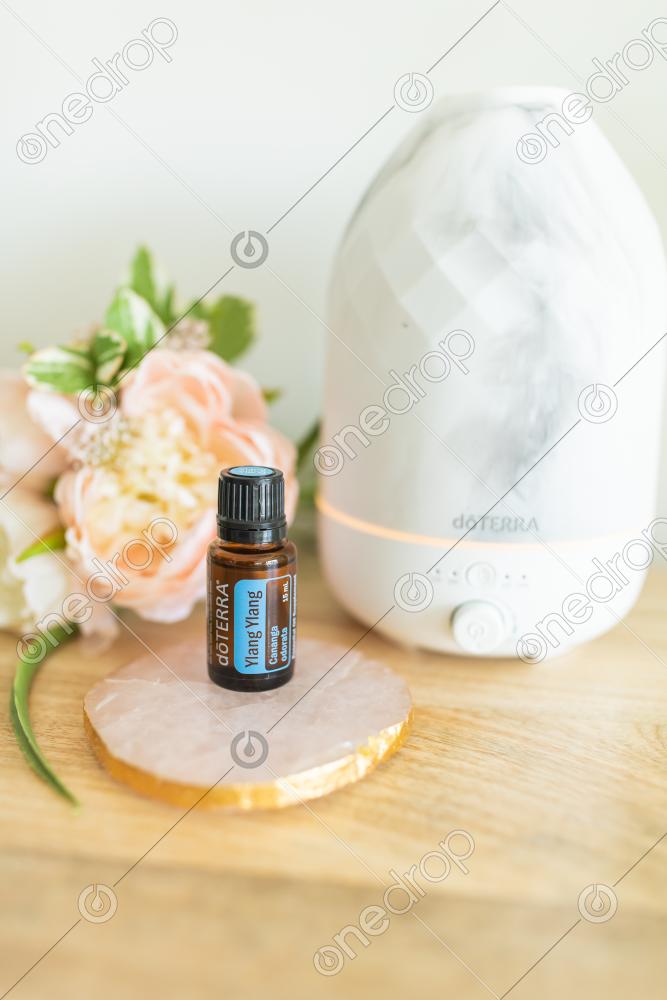 A high resolution image of 15 mL bottle of Ylang Ylang sitting next to a marble diffuser and pink flowers.