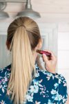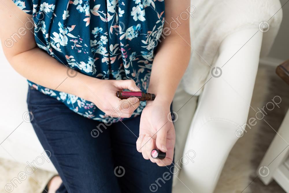 2 lifestyle images of a woman putting Rose Touch on her wrist and neck.