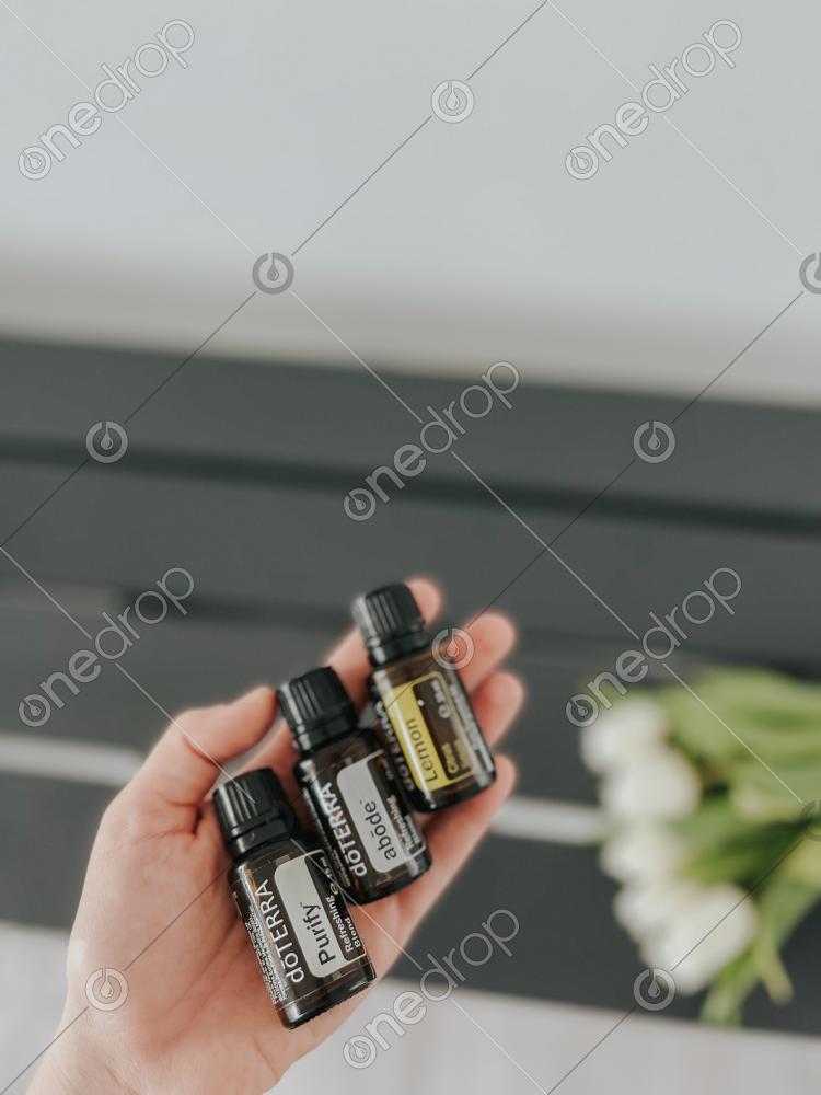 Abode, Purify and Lemon oils with some white tulips in the background as well as the oils in someone's hand.
