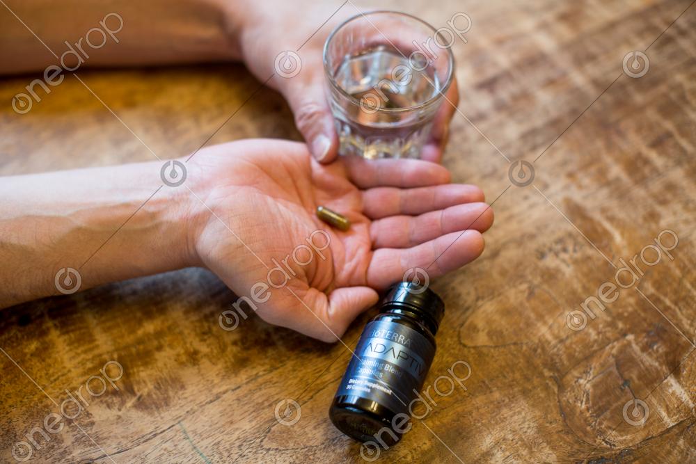 Adaptiv™ capsule in hand with water. Male hand on wooden table.