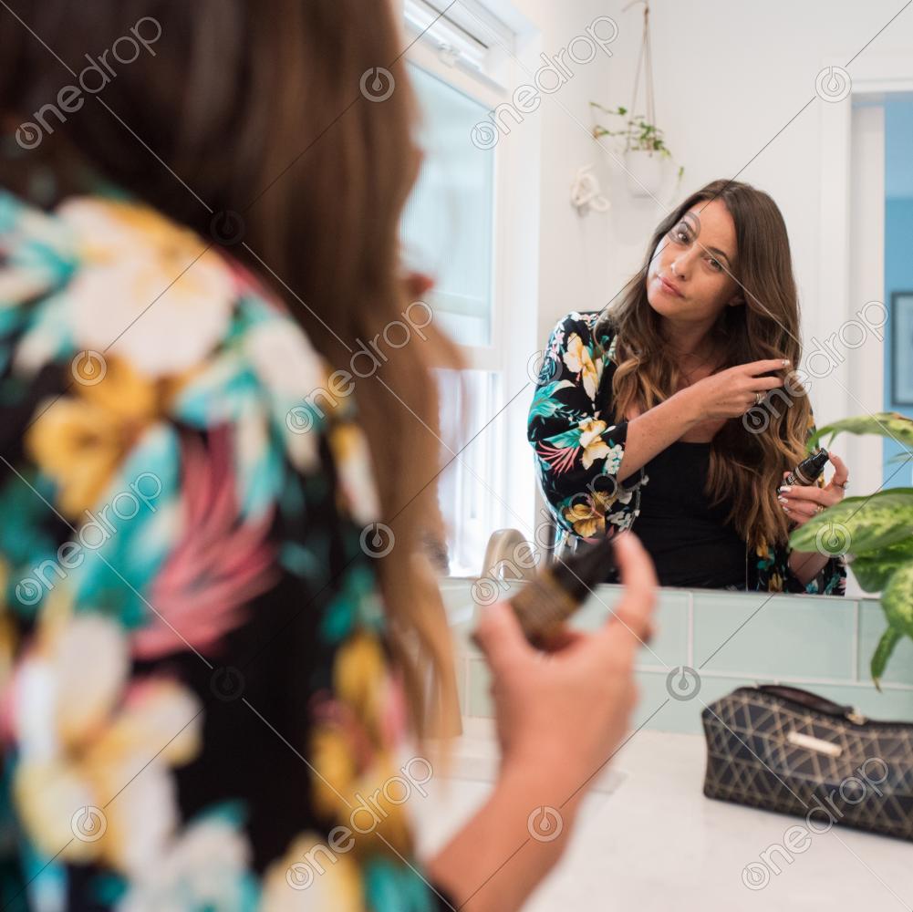 Woman applying root to tip serum to her hair