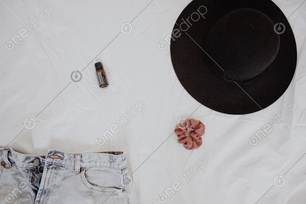 Lifestyle image of denim jeans, scrunchie, Balance and a black hat on a bed.