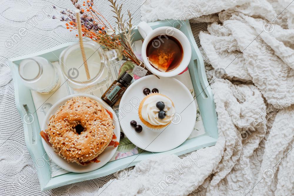 A brunch or breakfast on a tray with a bottle of balance