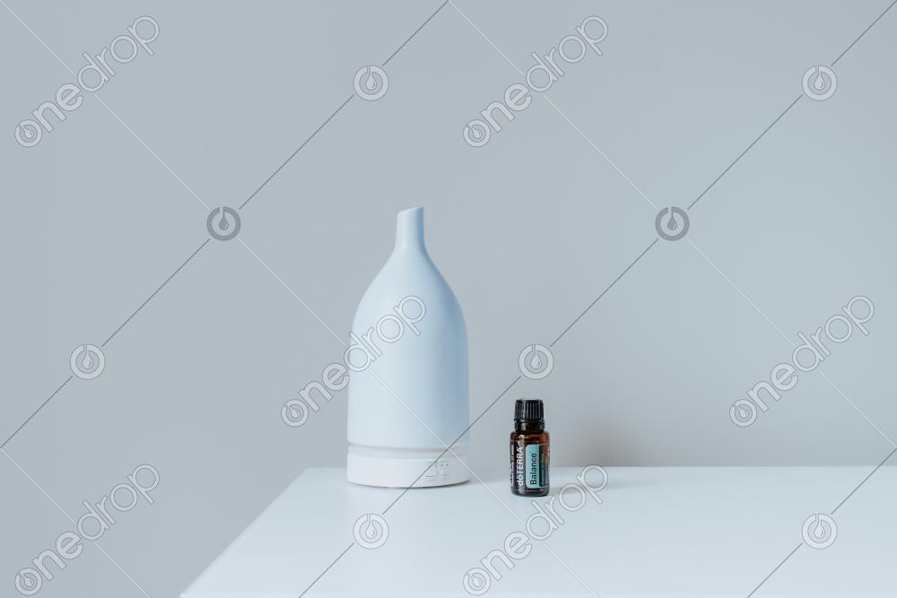 Photo of Balance Essential Oil Bottle beside Blue Diffuser on Minimal Background.