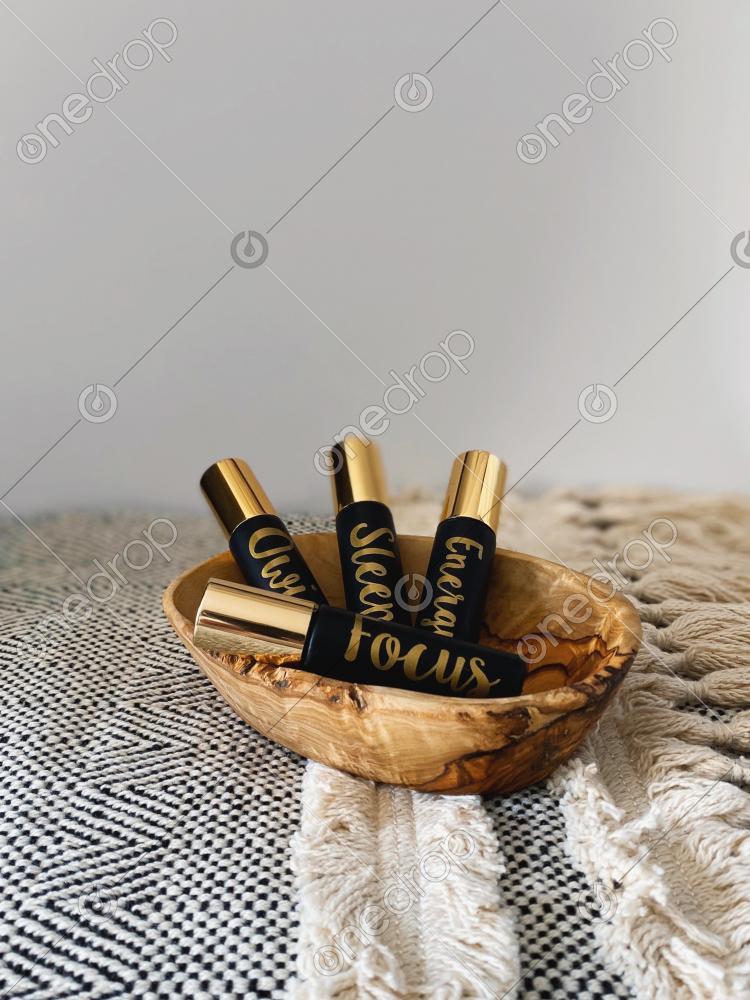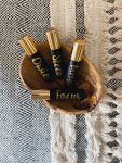 Two images of black roller bottles with gold lettering/lids, including focus, sleep, owie, and energy. Images are sized for socail media and would be great for sharing a roller bottle recipe.