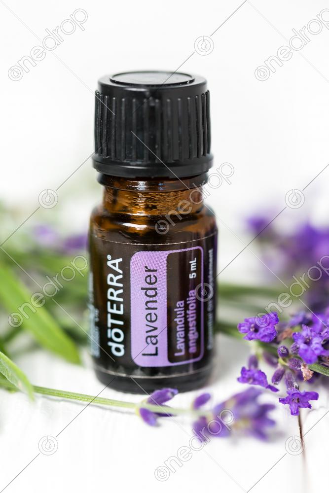 Bottle 5 ml of essential oil dōTERRA Lavender, copy space