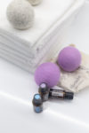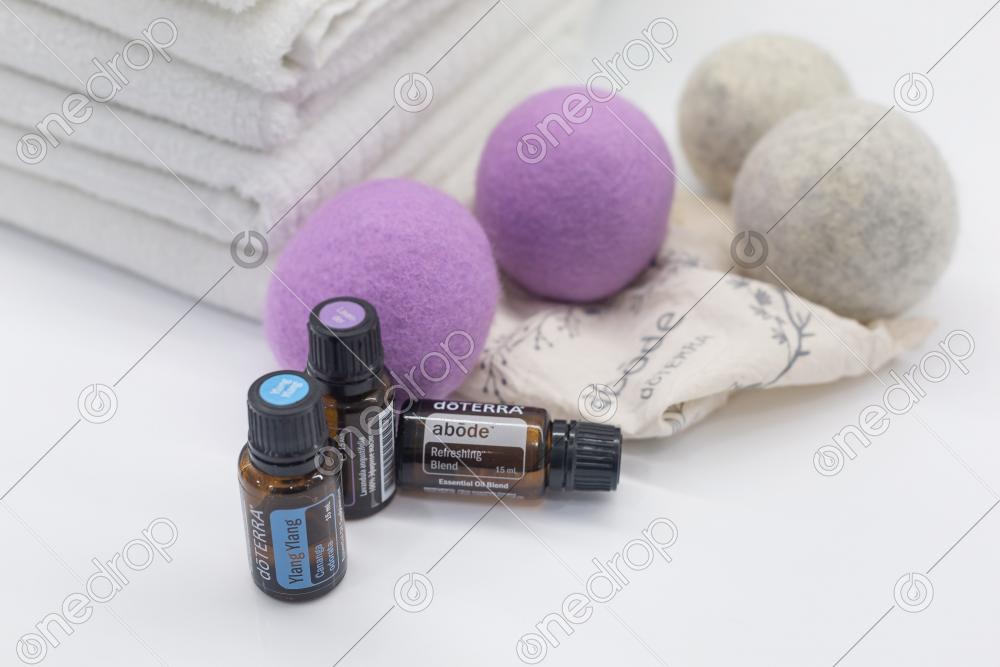 Bottles with different essential oils Lavender, Ylang-Ylang and blend Abode 15 ml on dryer balls background,