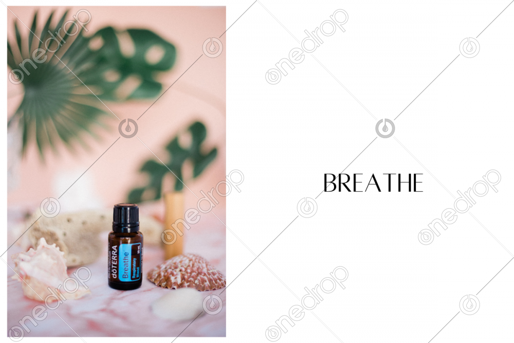 Breathe bottle surrounded by tropical greens, seaside elements and wood rollerball with pink/peach color pallet.