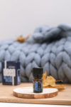 Essential soothing blend Deep Blue and sample rub lotion on blurred background in fall season interior