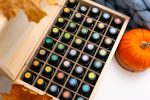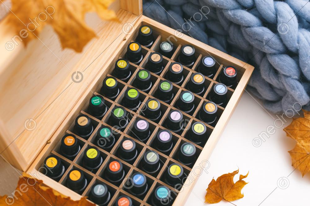 Collection of essential oils in wooden box decorated in autumn interior