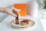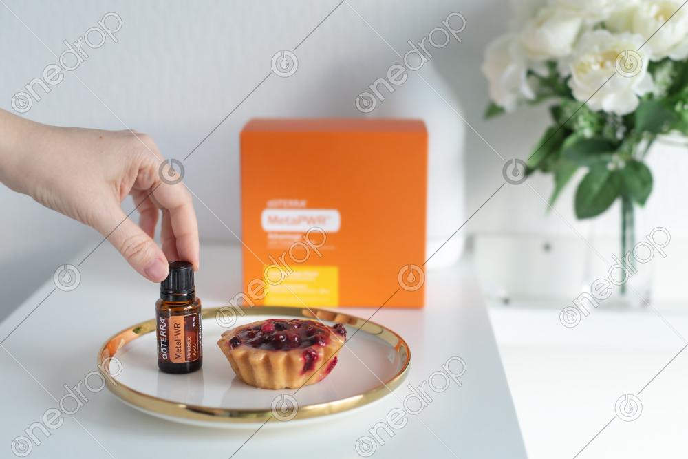 Female hand takes MetaPWR essential blend close to delicious cherry cake on plate, top view. Metabolic support concept