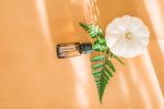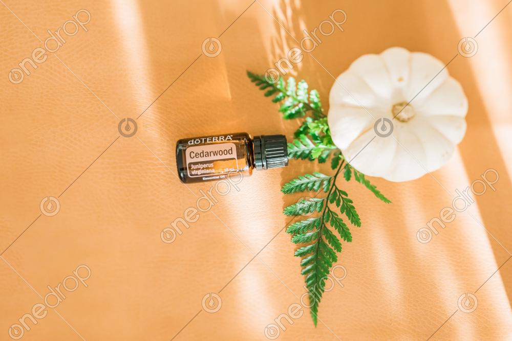 Cedarwood essential oil on brown background with a white pumpkin and Greenery. Blank space can be used to add text or high resolution image can be cropped creatively for Instagram or social media.