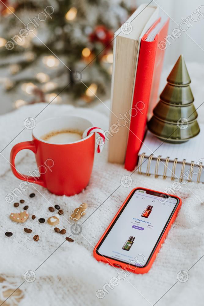 Cozy Christmas setting with phone and mug. You can use it to create engagement and talk about the holiday items or having your audience comment with their favorite Christmas oil.