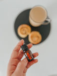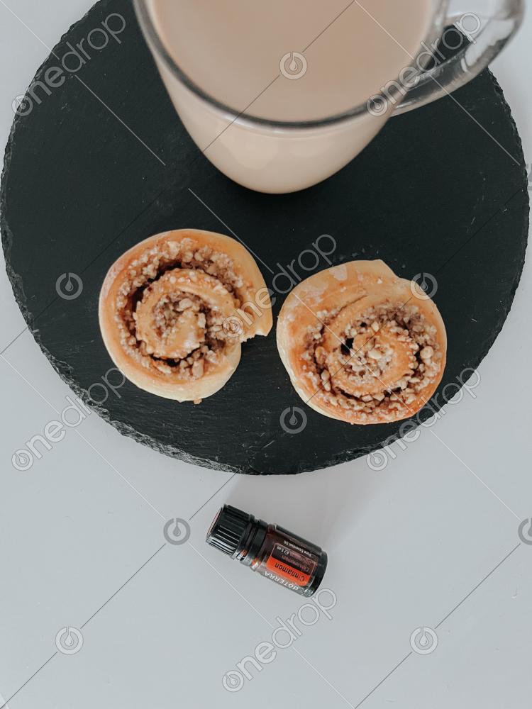 A display of the 5 ml Cinnamon oil together with Cinnamon rolls and a cup of coffee. The essential oil has been used for flavouring the cinnamon rolls.