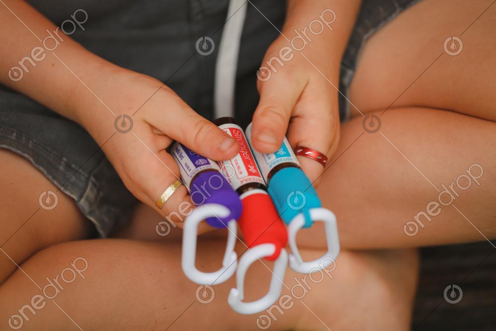 Close up of child's hands holding three oils from the Kid's Collection - Calmer, Stronger, Rescuer