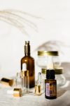 Collection of amber and clear glass essential oil diy containers to illustrate diy idea and EO usage.