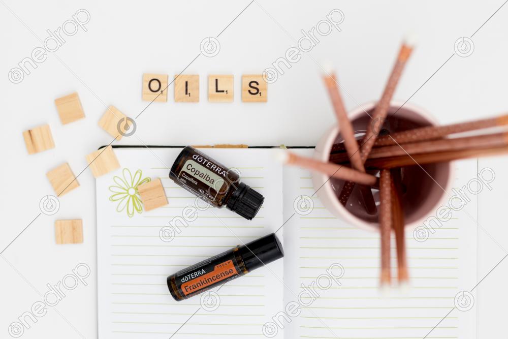 dōTERRA Copaiba and dōTERRA Frankincense on a desk
